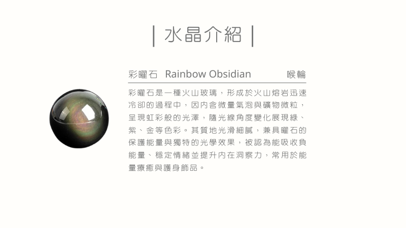 彩虹黑耀石,是黑耀石中最有名的一種。又可稱為彩虹閃光的彩虹黑曜岩,由于有些條文呈橢圓彩虹黑耀石形狀,就形成俗稱的單眼黑曜或者是雙眼黑曜石了。
