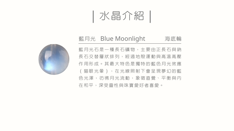 藍月光石是月光石(月長石)家族的一員,它擁有獨特藍色光澤,在光線折射下呈現出優美的藍光。它象徵靈性與愛情,被視為幸福、智慧的象徵。
