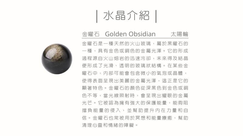 金曜石又名金沙黑曜石,是一種內含亮金色物質的黑曜石,金曜石被認為能抵禦、吸負能量和護身,常用於占卜術算。