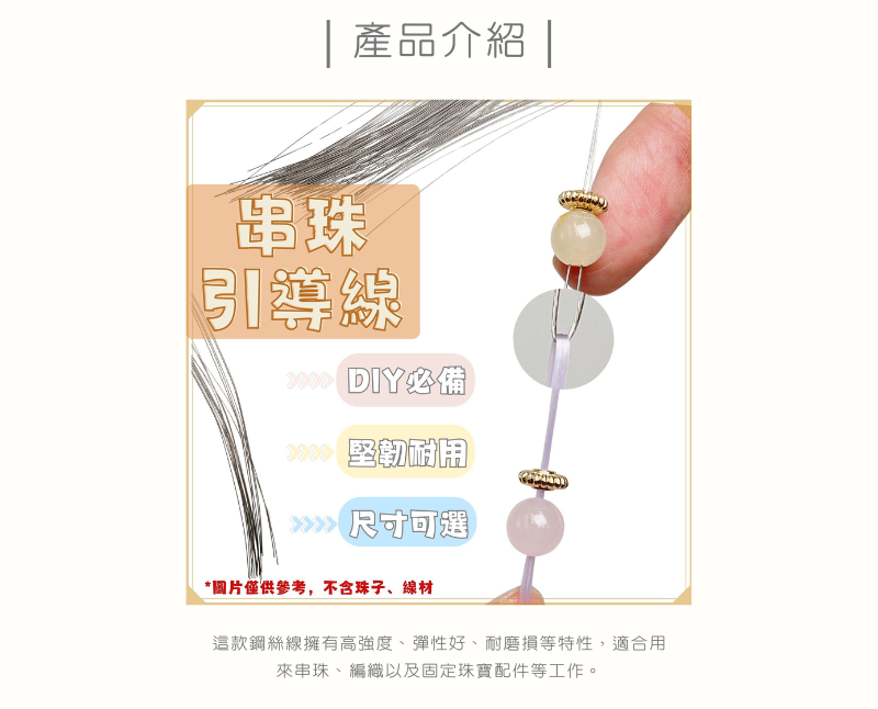鋼絲線是一種堅韌耐用的串珠線材,適用於DIY手作、珠寶設計及各類串珠工藝。常用於串接水晶、玉石、金屬珠等,提供更高的耐拉強度與穩固性。作為串珠引導線、穿引線或牽引線,能有效協助穿線作業,提高製作效率。適合各類手作材料與串珠材料。