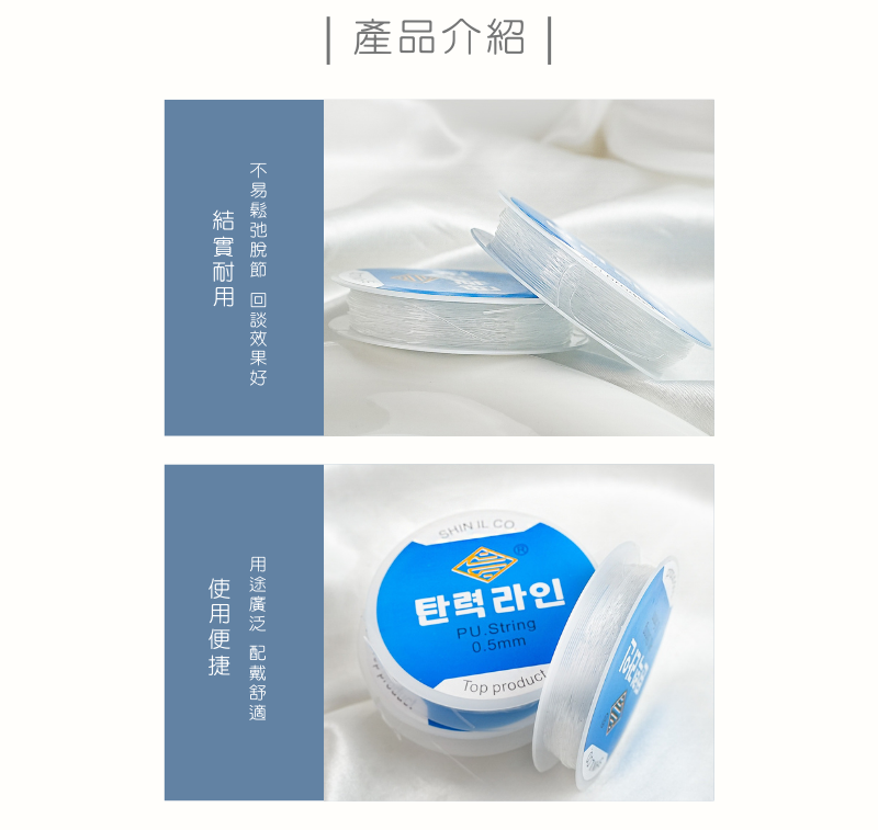 韓國透明彈性線韌度高不易斷裂,且線材本身是透明的,在串色較清澈透明的水晶時,比較不會影響到作品呈現的色澤度。