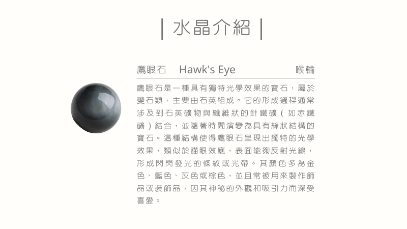 鷹眼石是虎眼石未完成的矽化過程所產生的藍色變異種,通常為藍色和灰藍色,貌似鷹眼,故稱「鷹眼石」。