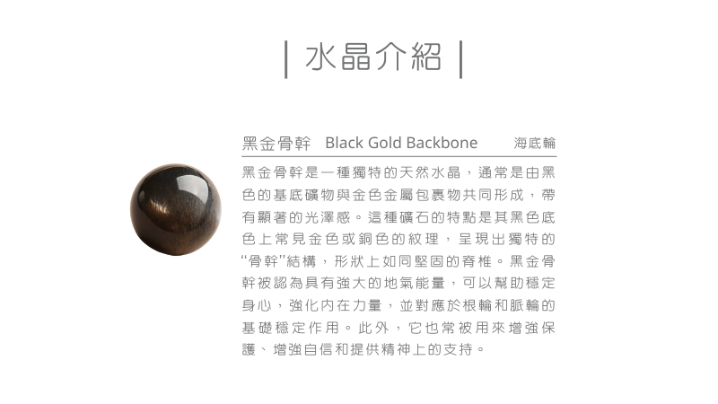 黑太陽石又能稱為黑骨幹,呈現灰黑色的光澤,內含纖鐵礦或赤鐵礦髮絲,隨光線折射出金銀色的貓眼效果。